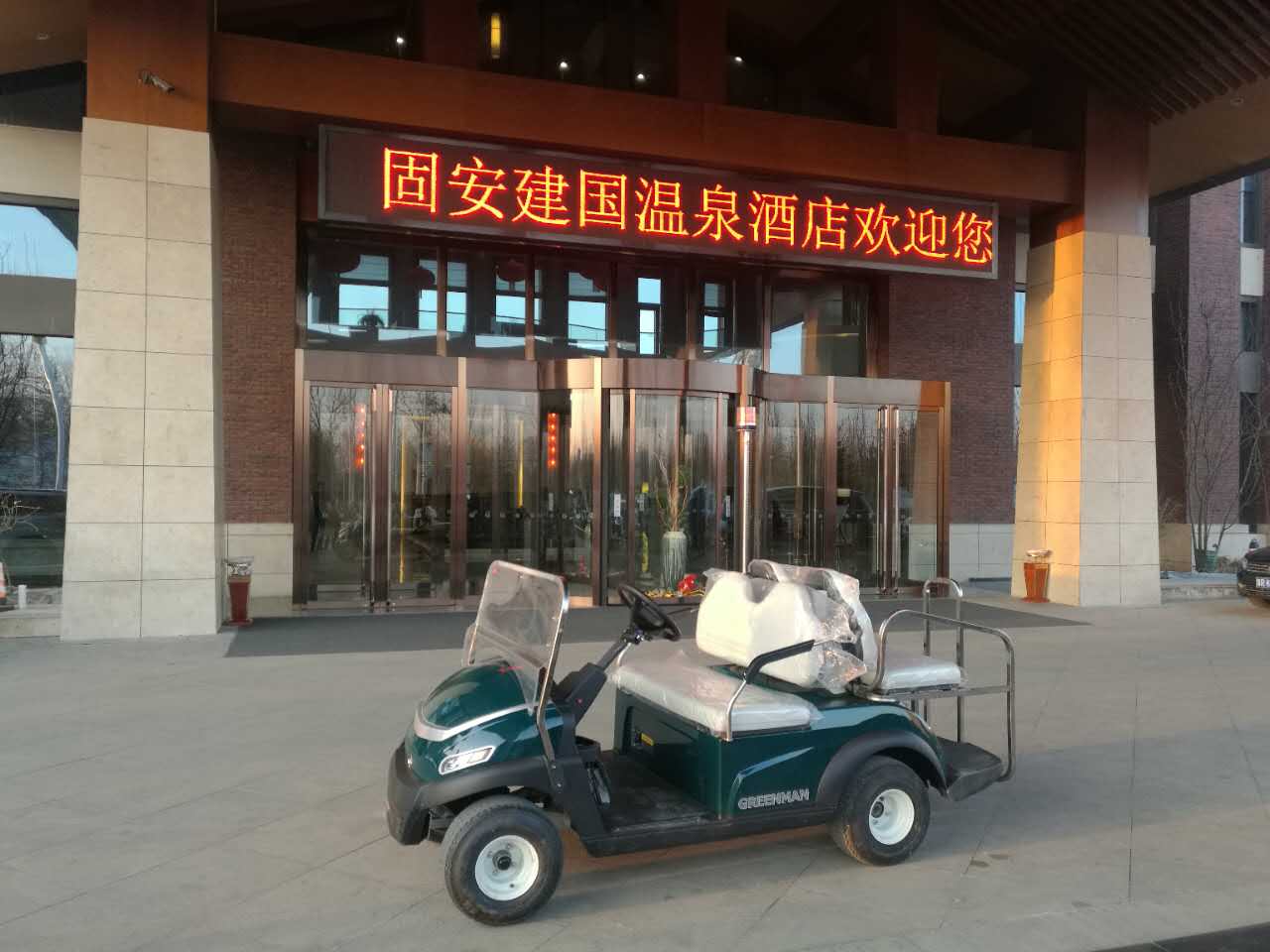 2017年3月8日在河北省廊坊市固安溫泉休閑商務(wù)產(chǎn)業(yè)園交車1臺四座電動(dòng)觀光車。