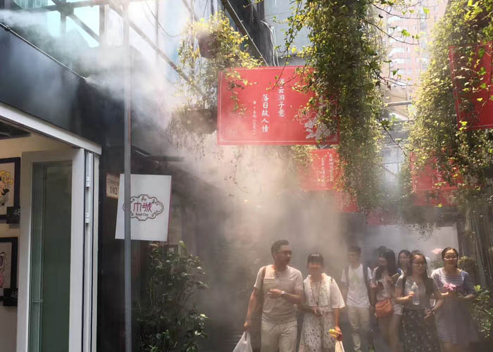 作為上海的3A景區之一,田子坊每天都人頭攢動,連日高溫讓許多游客不能細細品味老上海的弄堂風情。為此,管委會采用了綠友集團自行研發制造的GREENMAN造霧系統,200多個噴頭每小時噴霧三次,每次噴霧2分鐘,配合弄堂兩邊墻壁種植的綠化,不僅美化了街景,更對降低整個田子坊的溫度起到了有效的作用。現場溫度計顯示,不進行噴霧的弄堂溫度是36 攝氏度,噴霧后,弄堂溫度顯示33攝氏度,最低的地方溫度甚至降到28攝氏度,降溫明顯。