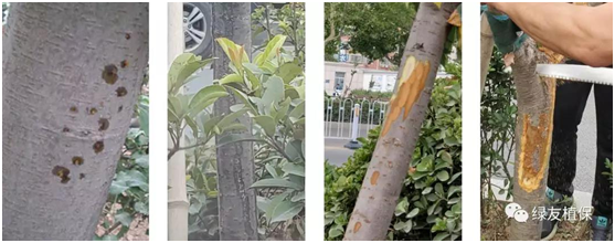 筆者上周在河南等地走訪各大公園、主干道路時發現,櫻花、海棠等中等喬木的樹木葉片開始發黃枯萎,葉片掉落,很多養護人員誤認為是葉片病害,葉噴百菌清等殺菌農藥,卻不見起色;待到后期主干、主枝出現潰瘍、腐爛、干腐,甚至爆皮,最終導致枝干脫水死亡。