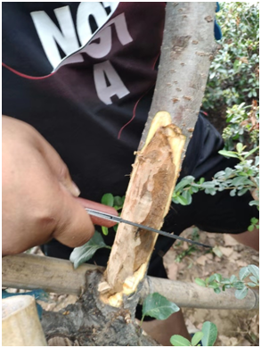 將腐爛的樹皮刮掉,刮干凈腐爛部分,露出正常組織。