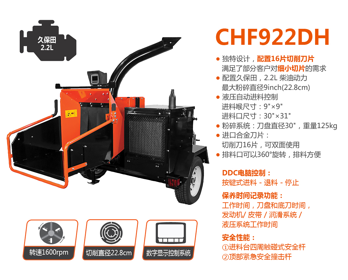 老熊(BEARCAT)品牌樹枝粉碎機,配置久保田2.2L柴油機,動力更強勁,最大可切削直徑23cm樹枝;智能液壓進料系統可自動監控發動機轉速和進料狀態,根據進料負荷的大小自動調整進退料;噴料口可360度旋轉,隨意選擇噴料方向;切削刀片經過特殊處理,堅固耐用并可多次修磨。