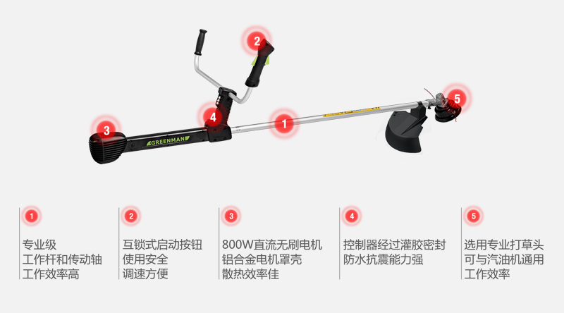 GREENMAN 電動(dòng)割灌割草機(jī)從國(guó)內(nèi)綠化管理的實(shí)際情況出發(fā),選用800W大功率直流無刷電機(jī)和大直徑打草繩。在實(shí)現(xiàn)電動(dòng)化的同時(shí),又能滿足綠化養(yǎng)護(hù)的高效率。