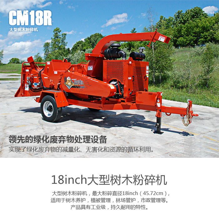 大型樹木粉碎機,最大粉碎直徑18inch(45.72cm),適用于樹木養(yǎng)護,植被管理,林場管護,市政管理等。產(chǎn)品具有工業(yè)級,持久耐用的特性。